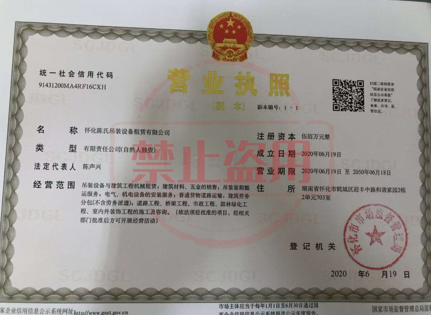 荣誉资质 怀化陈氏吊装设备租赁有限公司营业执照